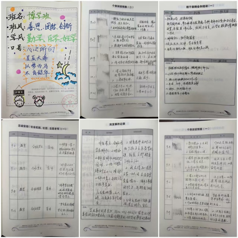 其中,金晓红老师、毛丽菁老师在《班主任工作手册》填写中表现尤为突出,不仅所有必填板块无遗漏,且主题班会预案细节丰富、家校联系记录具体详实,班级奖惩与大事记完整呈现,为全体班主任提供了优秀范例,特此提出表扬。