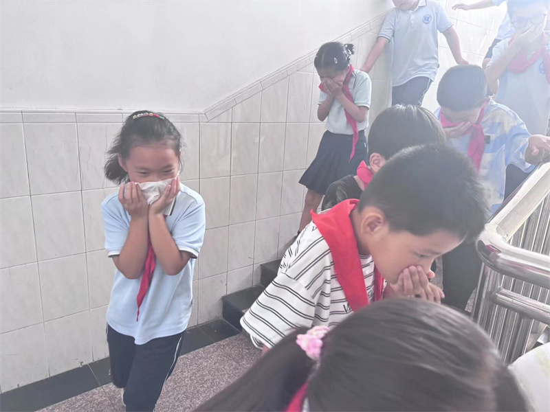 上午9:05分随着消防警报的响起,演练正式开始。全体师生迅速进入应急状态,捂住口鼻,弯腰低身,按照预定的线路,有序撤离到安全区域。到达安全区域后,各年级各班迅速清点人数,切实做到了不慌乱、不遗漏!