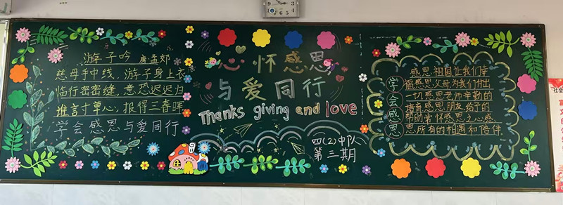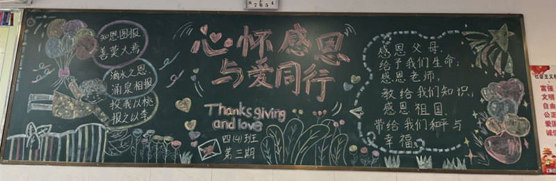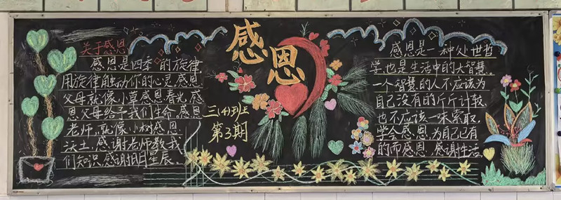各班级积极响应,充分利用黑板报这一方天地,精心构思,巧妙创作。板报内容丰富多彩,既有对父母养育之恩的感念,也有对老师教诲之情的感谢,更有对同学、朋友及社会关爱的赞美。一幅幅精美的图画,一段段真挚的文字,凝聚了同学们深深的感恩之心,展现了他们积极向上的精神风貌。