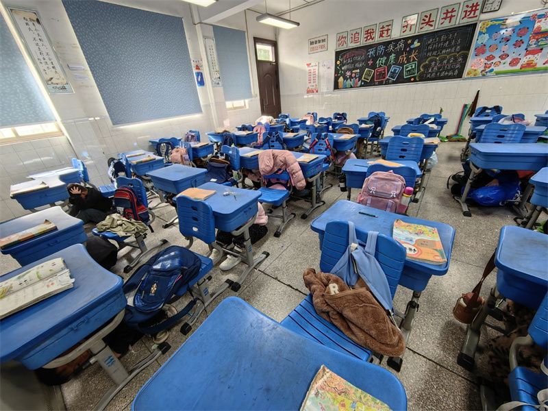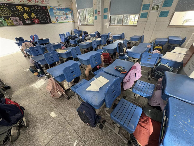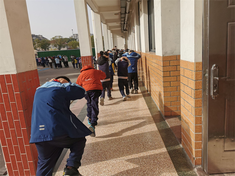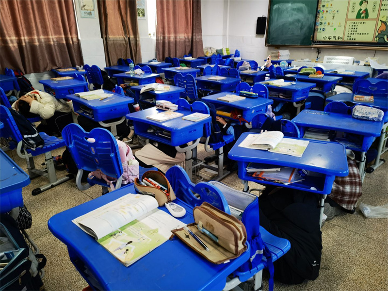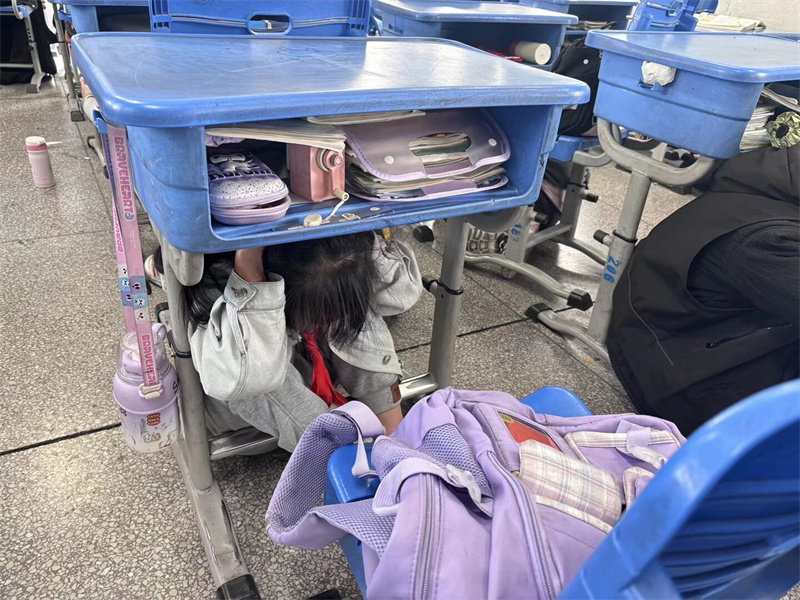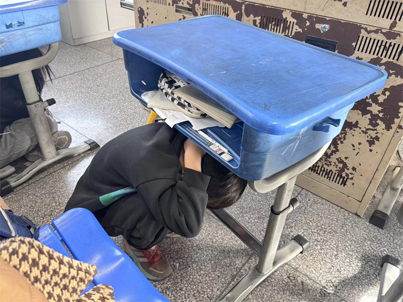 上午9时许,随着急促的防震预警信号响起,演练正式开始。正在上课的师生迅速做出反应,按照预定避险规范,双手抱头、弯腰屈膝,快速躲到课桌下方,并用书本、书包等物品保护头部,避免头部受到撞击,整个避险过程紧张有序。约1分钟后,疏散信号响起,各班级班主任及随堂教师立即组织学生按照指定疏散路线,弯腰、护头、快速有序地向操场空旷区域撤离。撤离过程中,学生们听从指挥、不推挤、不慌张,沿着教学楼走廊、楼梯快速疏散。