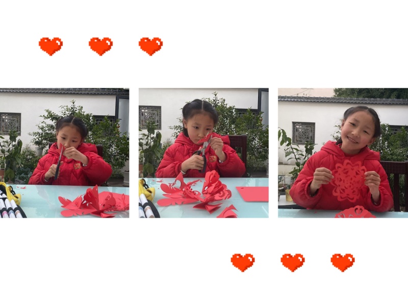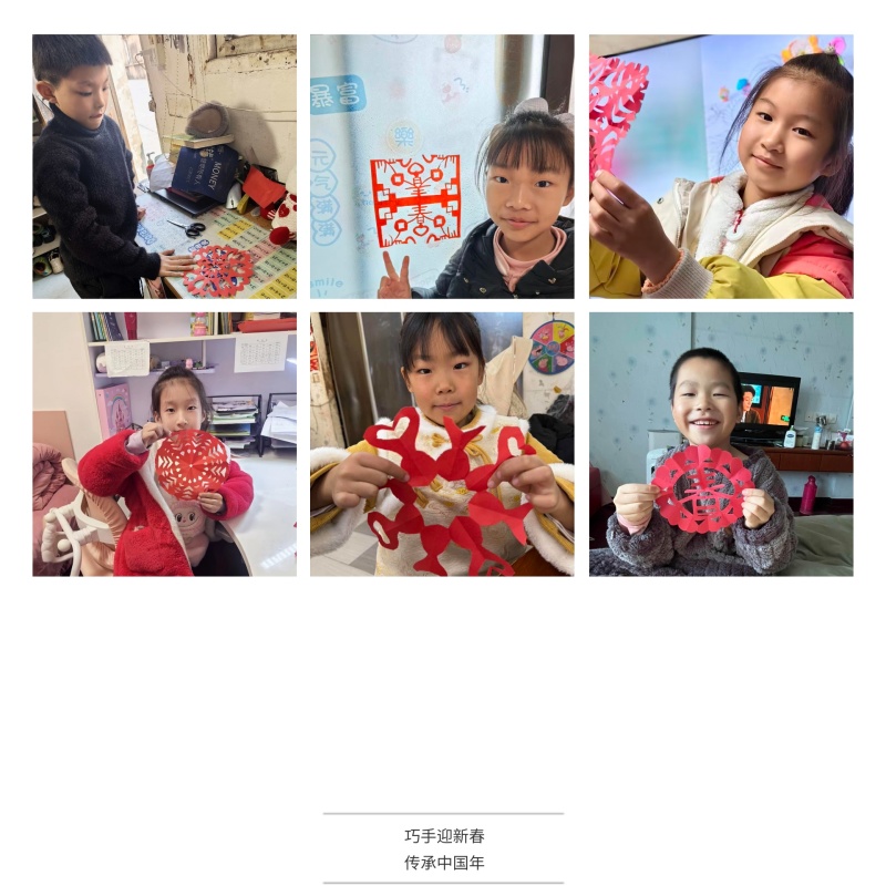 活动中,一、二、三年级学生聚焦吉祥窗花剪纸。在家长的指导下,孩子们备好安全儿童剪刀、红色宣纸等工具,了解雪花、福字等图案的对称特点与团圆、喜庆的美好寓意,或勾勒轮廓,或对折裁剪,小心翼翼地剪出一张张精美的窗花,张贴于窗户、墙面后,还主动分享图案背后的寓意。