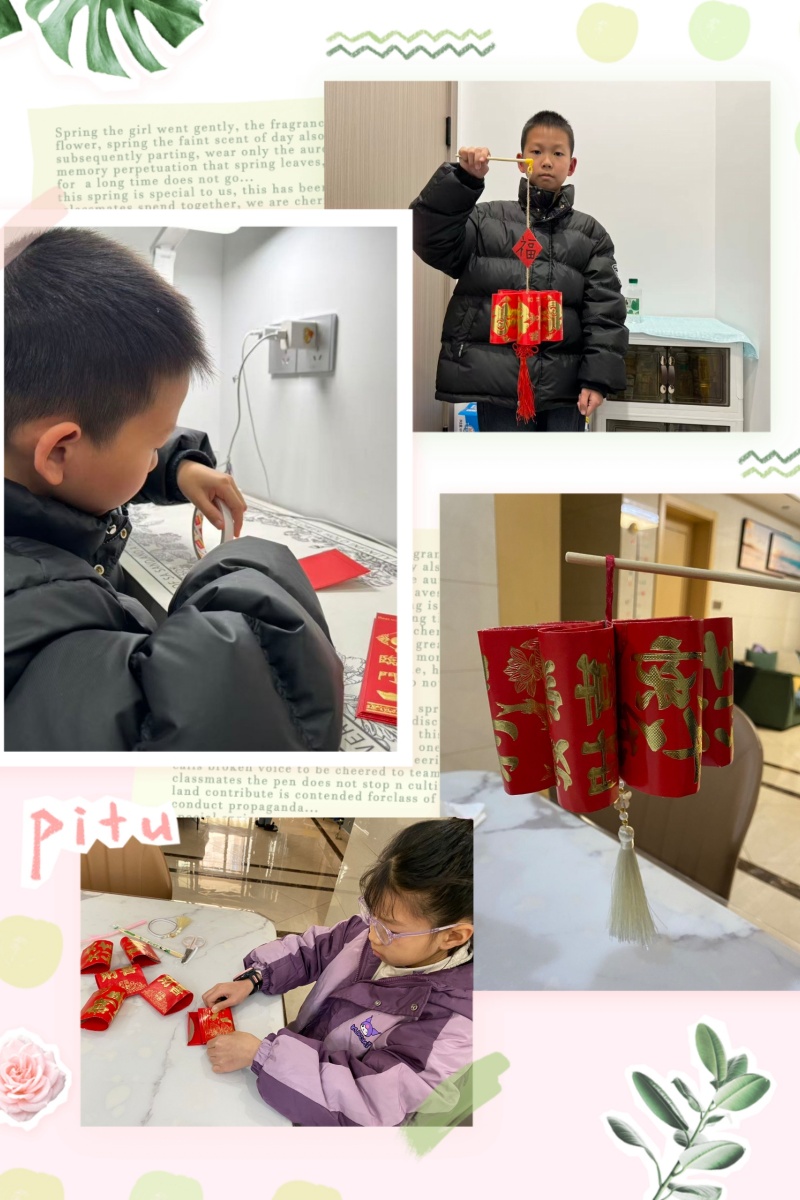 四、五年级学生则挑战手工灯笼制作。大家收集废旧红包、硬卡纸等材料,搭配剪刀、胶水、细绳等工具,先将红包对折粘合成圆筒状,再用圆形卡纸固定顶部与底部,翻折红包开口形成 “花边”,最后装上提手、贴上贴纸、挂上流苏,一个个造型别致的灯笼便应运而生。