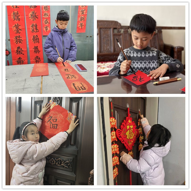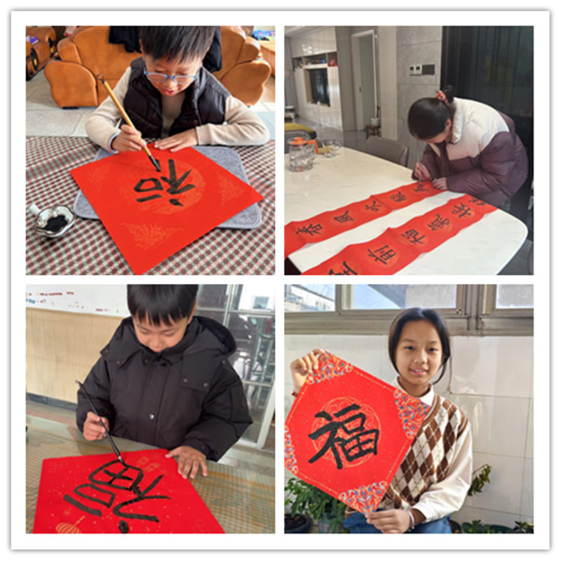 一笔一划,浸润的是传统文化;一撇一捺,书写的是新年期盼。在长辈的悉心指导下,同学们铺纸研墨,挥毫泼墨。一个个饱满的“福”字,一副副寓意吉祥的春联,不仅贴在了自家门上,更贴在了孩子们的心里。
